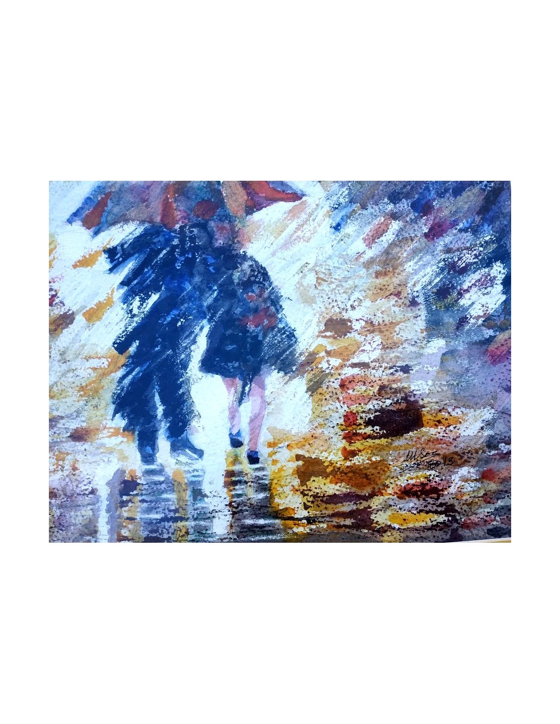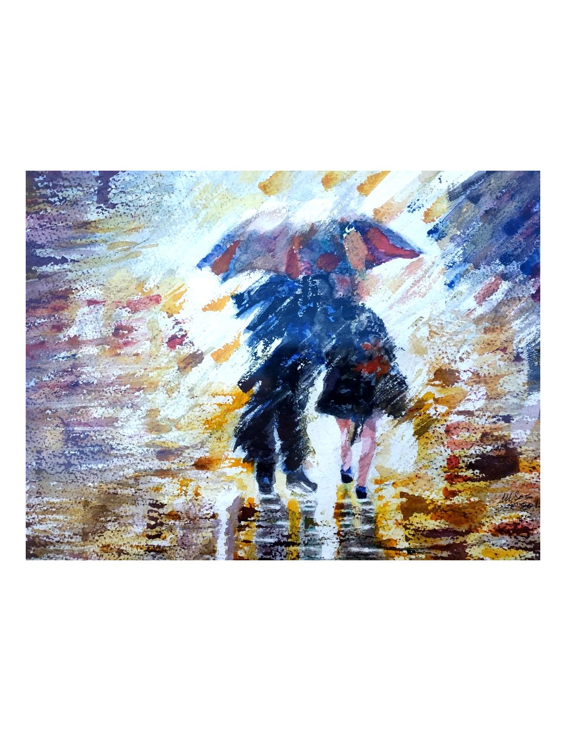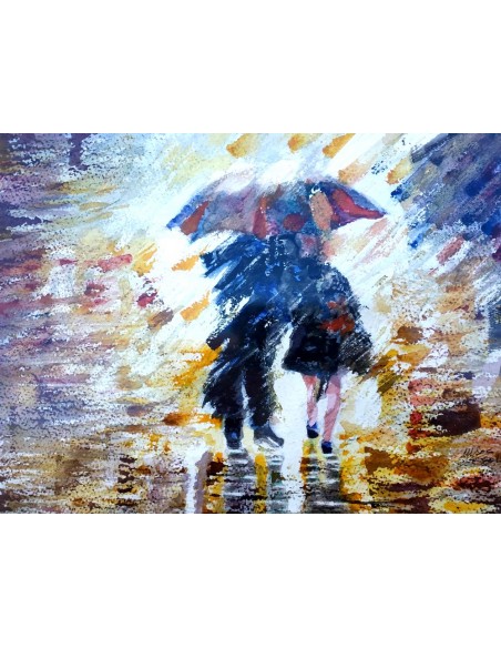 PASEANDO CON LLUVIA Y VIENTO acuarela sobre papel, grano grueso.