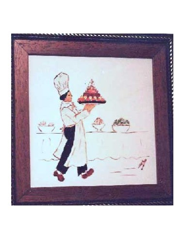 LES MARMITONS, PINCHE LLEVANDO LA TARTA. es un gres cerámico, pintado a la cuerda seca y con grasas. Es la técnica de mezclar un pigmento (óxido) con azúcar y grasa y miel. Y para ello se suele utilizar un pincel fino o una plumilla para pintar los perfiles. El resto del baldosín está pintado con grasas. Se denomina así a la mezcla de pigmentos coloreados con grasa miel y aguarrás. Se puede utilizar pincel o esponja dependiendo de la superficie a pintar. Medidas : 26,5x26,5 cm. COLECCIÓN de 10 baldosines para decorar la cocina. Autor: Mercedes Sos.