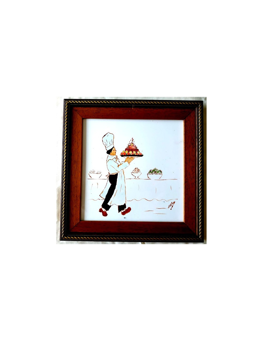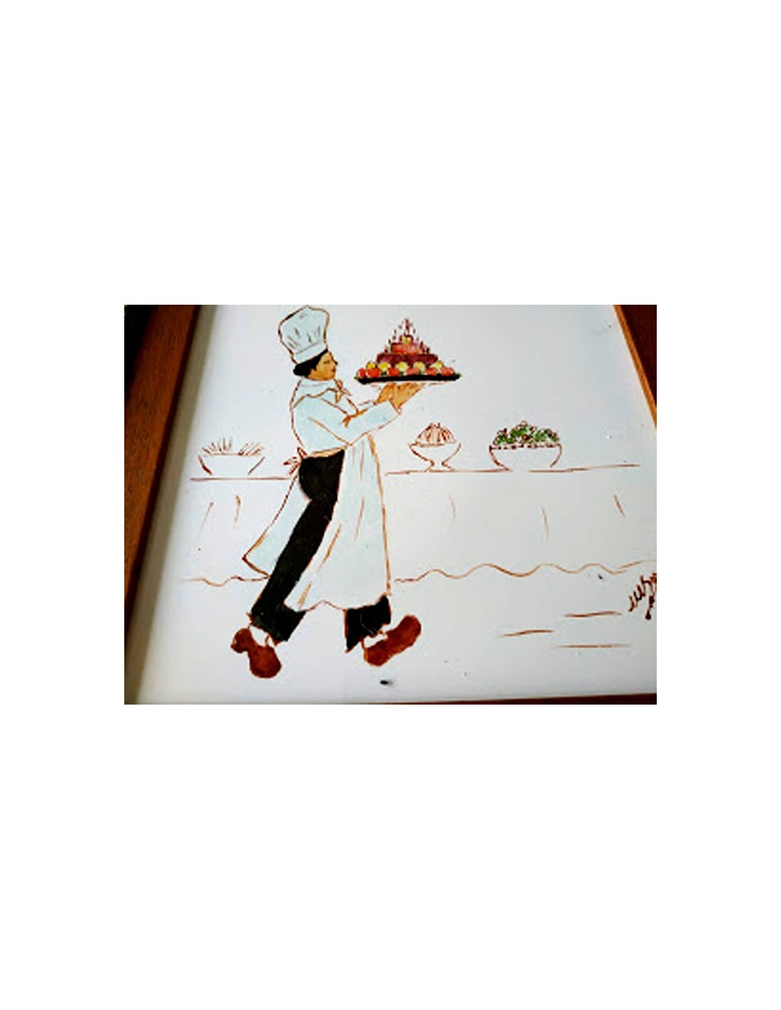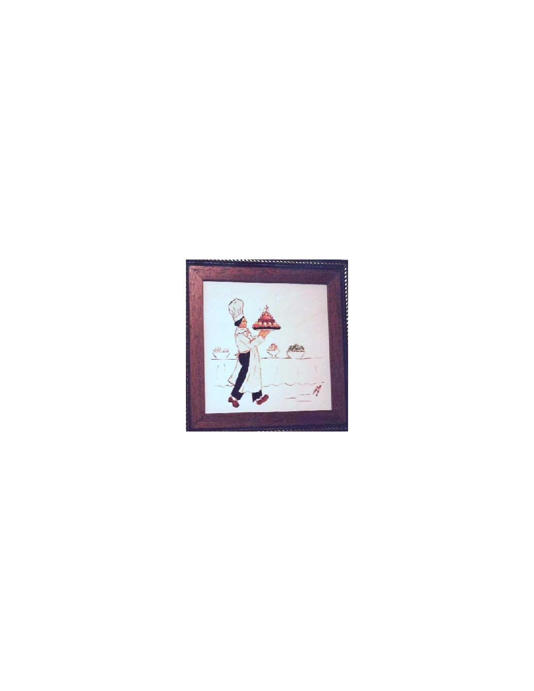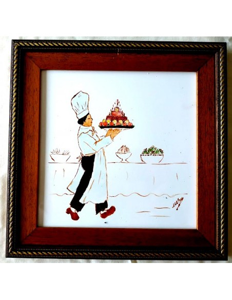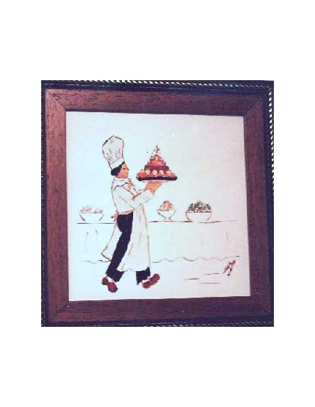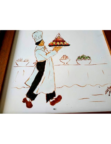 LES MARMITONS. PINCHE LLEVANDO LA TARTA. es un gres cerámico, pintado a la cuerda seca y con grasas. Es la técnica de mezclar un pigmento (óxido) con azúcar y grasa y miel. Y para ello se suele utilizar un pincel fino o una plumilla para pintar los perfiles. El resto del baldosín está pintado con grasas. Se denomina así a la mezcla de pigmentos coloreados con grasa miel y aguarrás. Se puede utilizar pincel o esponja dependiendo de la superficie a pintar. Medidas : 26,5x26,5 cm. COLECCIÓN de 10 baldosines para decorar la cocina. Autor: Mercedes SoS.