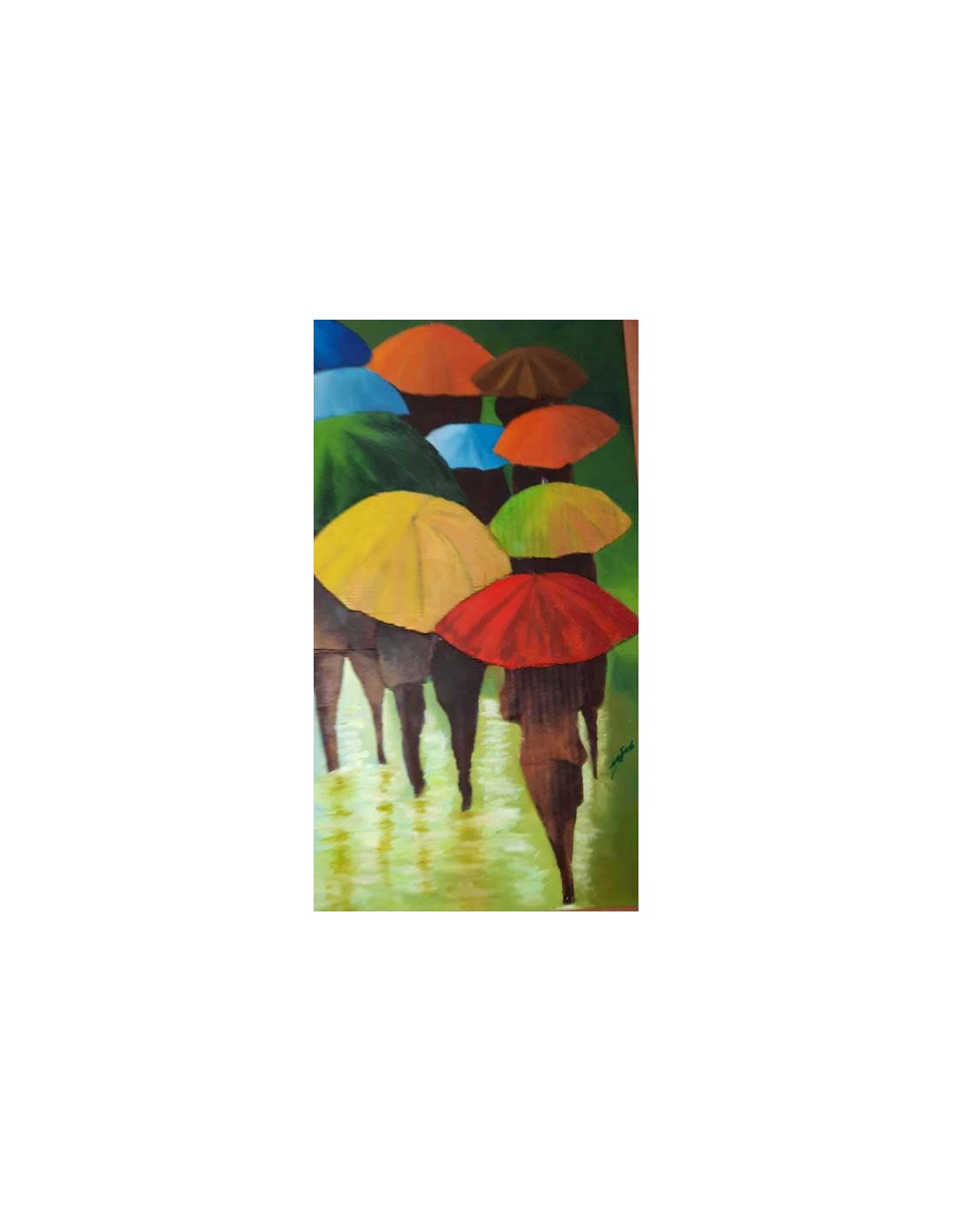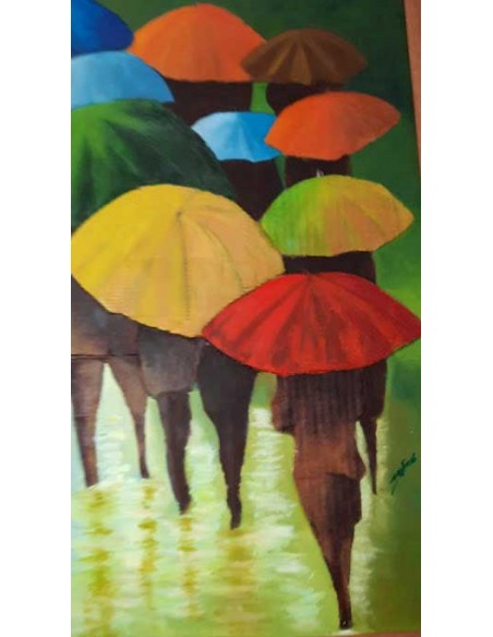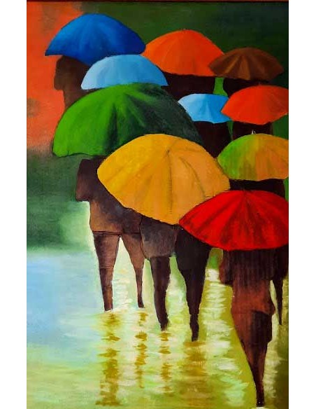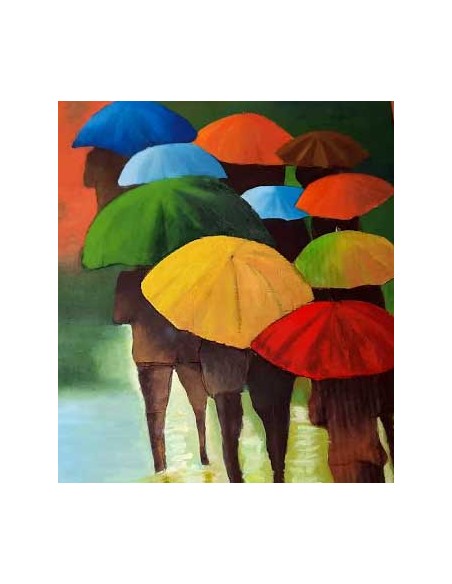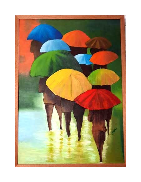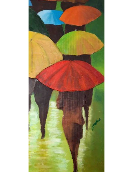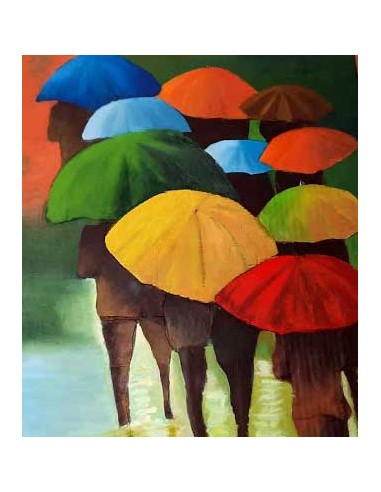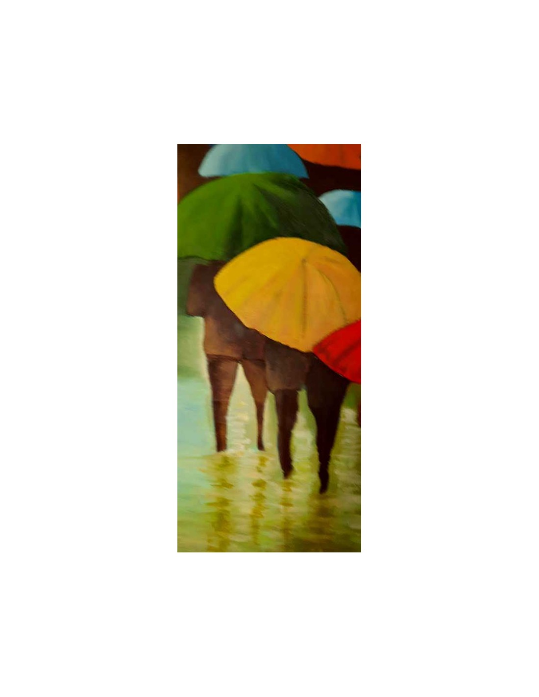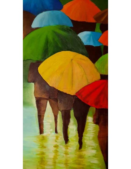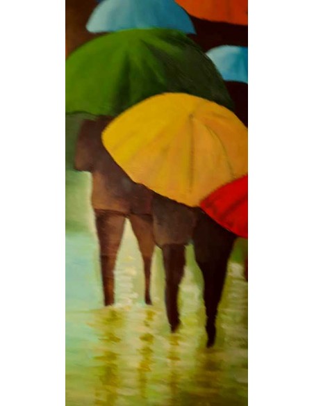 En este óleo "la lluvia y los contrastes de los paraguas armonizan un nuevo paisaje que hace que la vida sea diferente" (Mercedes Sos) - acostumbrada a su sol mediterráneo