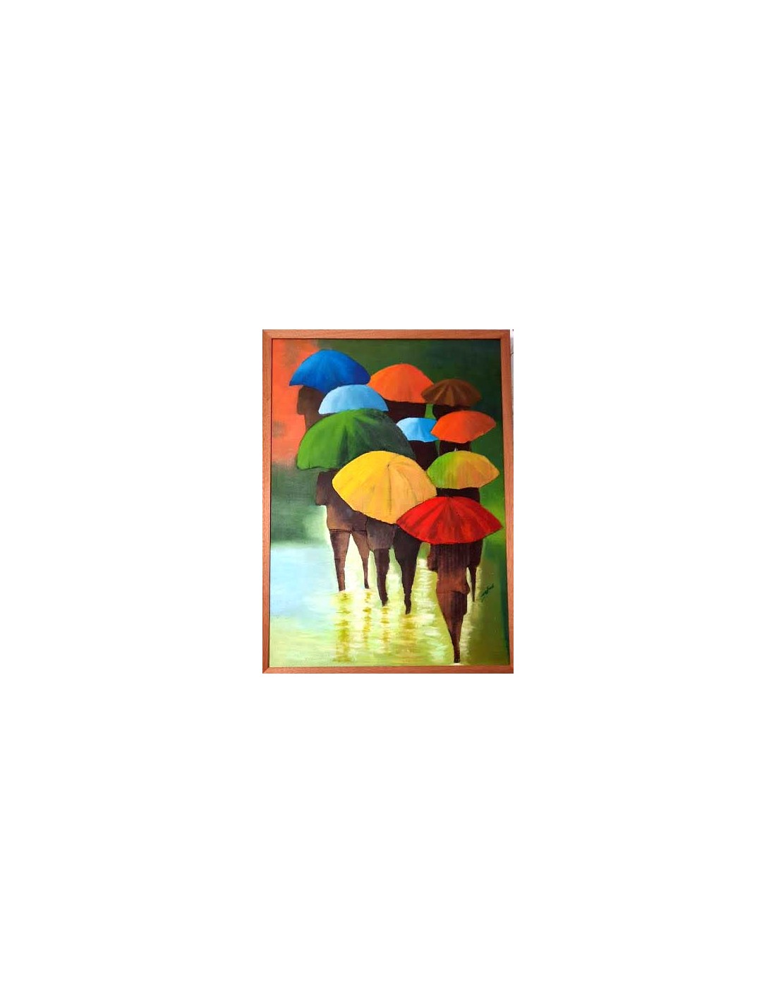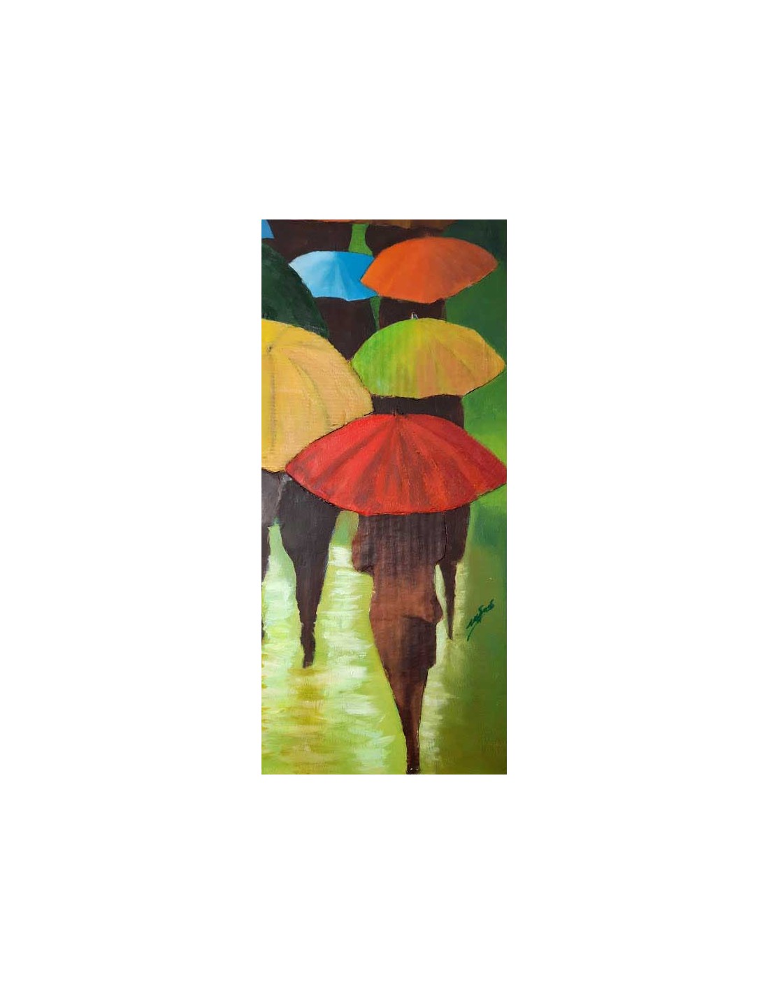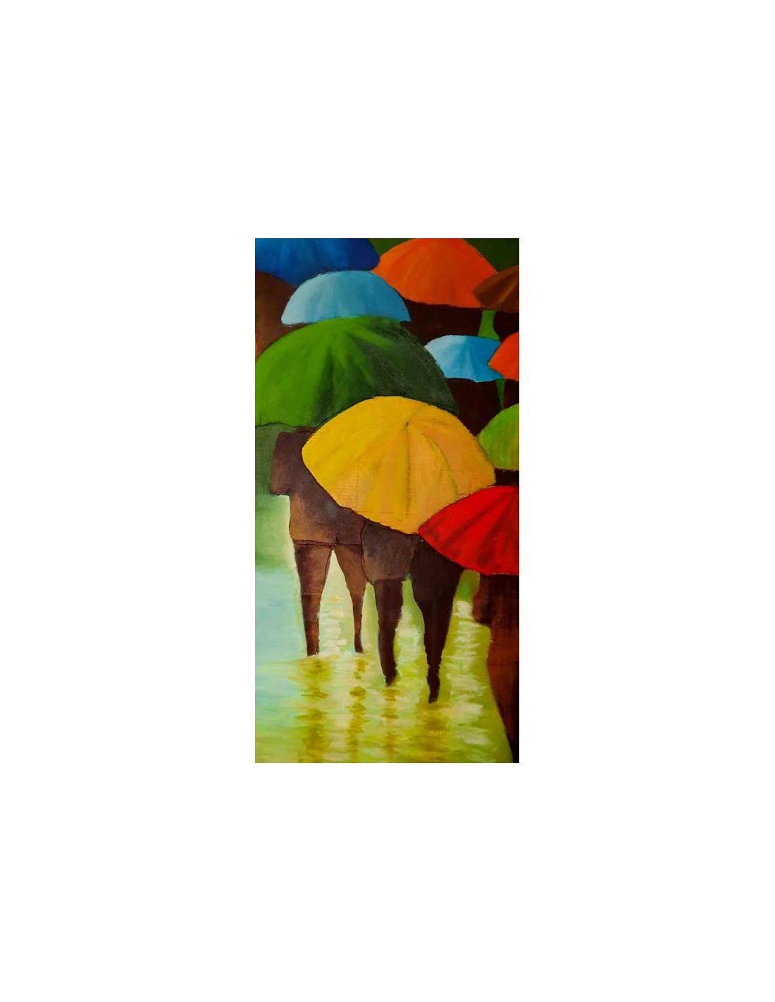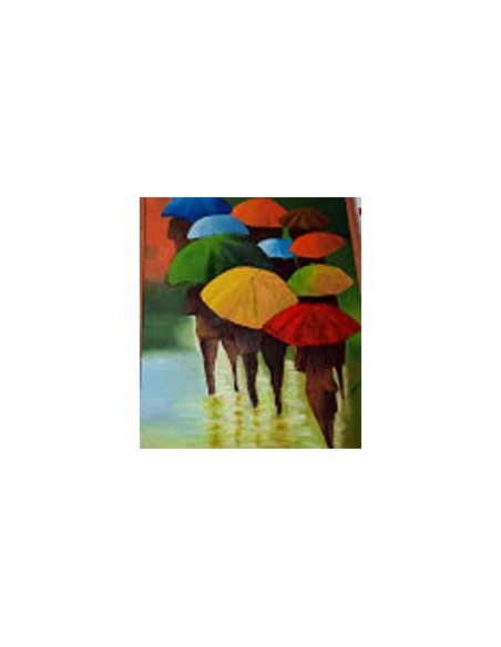 En este óleo "la lluvia y los contrastes de los paraguas armonizan un nuevo paisaje que hace que la vida sea diferente" (Mercedes Sos) - acostumbrada a su sol mediterráneo