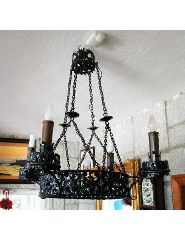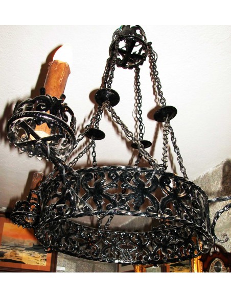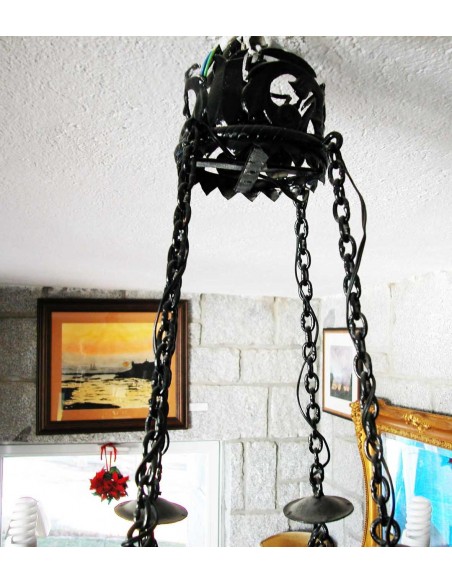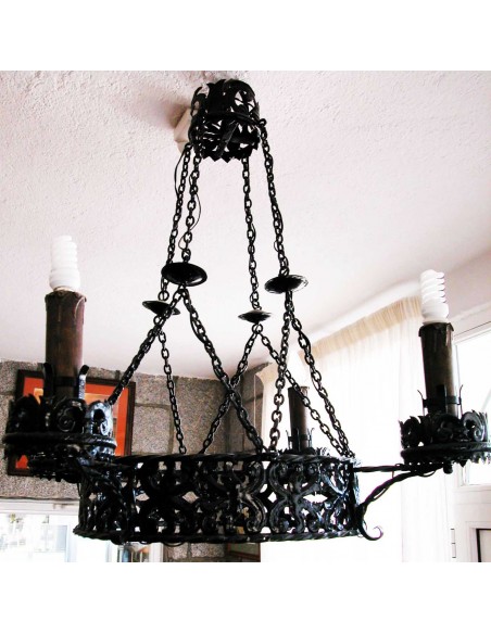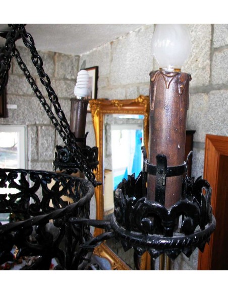 Antigua lámpara de hierro forjado del S. XVIII, en negro, con cuatro VELAS (20X5 cm) que iluminan, con varios anillos de forja con dibujos de hojas naturales, colgada de un sistema de cadenas, con posibilidad de ser colgar por un polipasto y sistema de poleas, de una gran cadena con plafón de techo que realza su majestuosidad señorial,