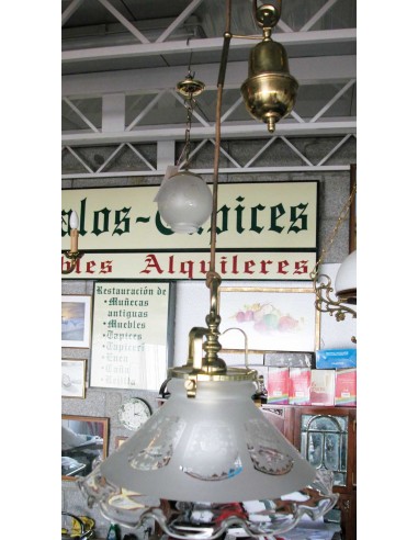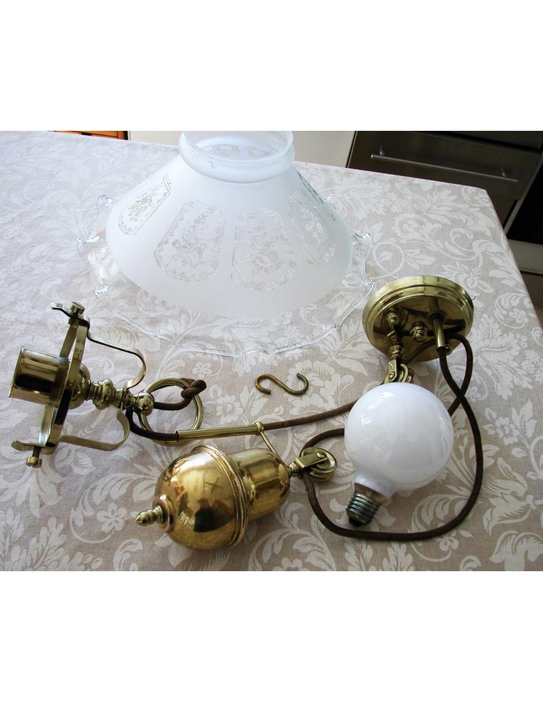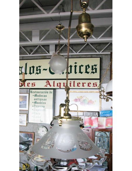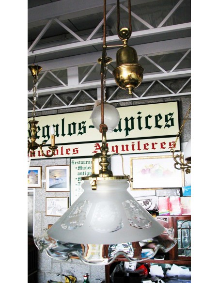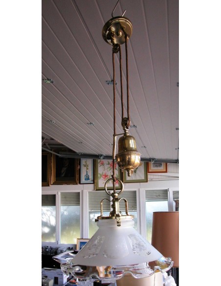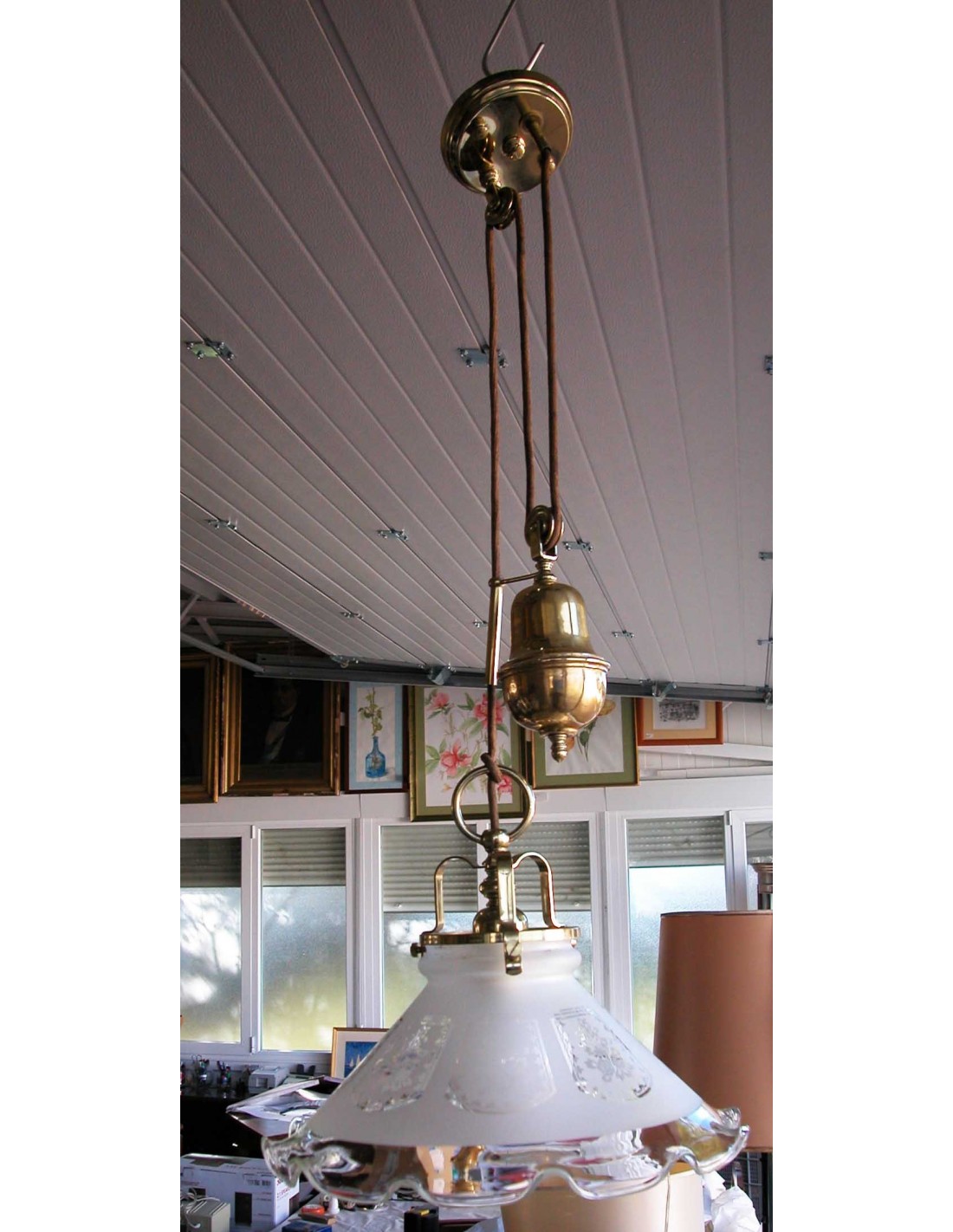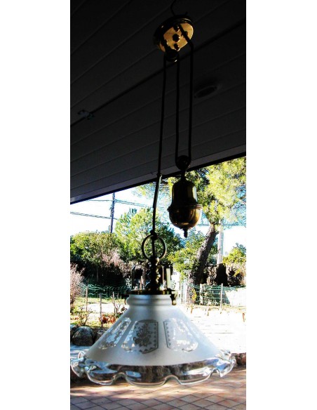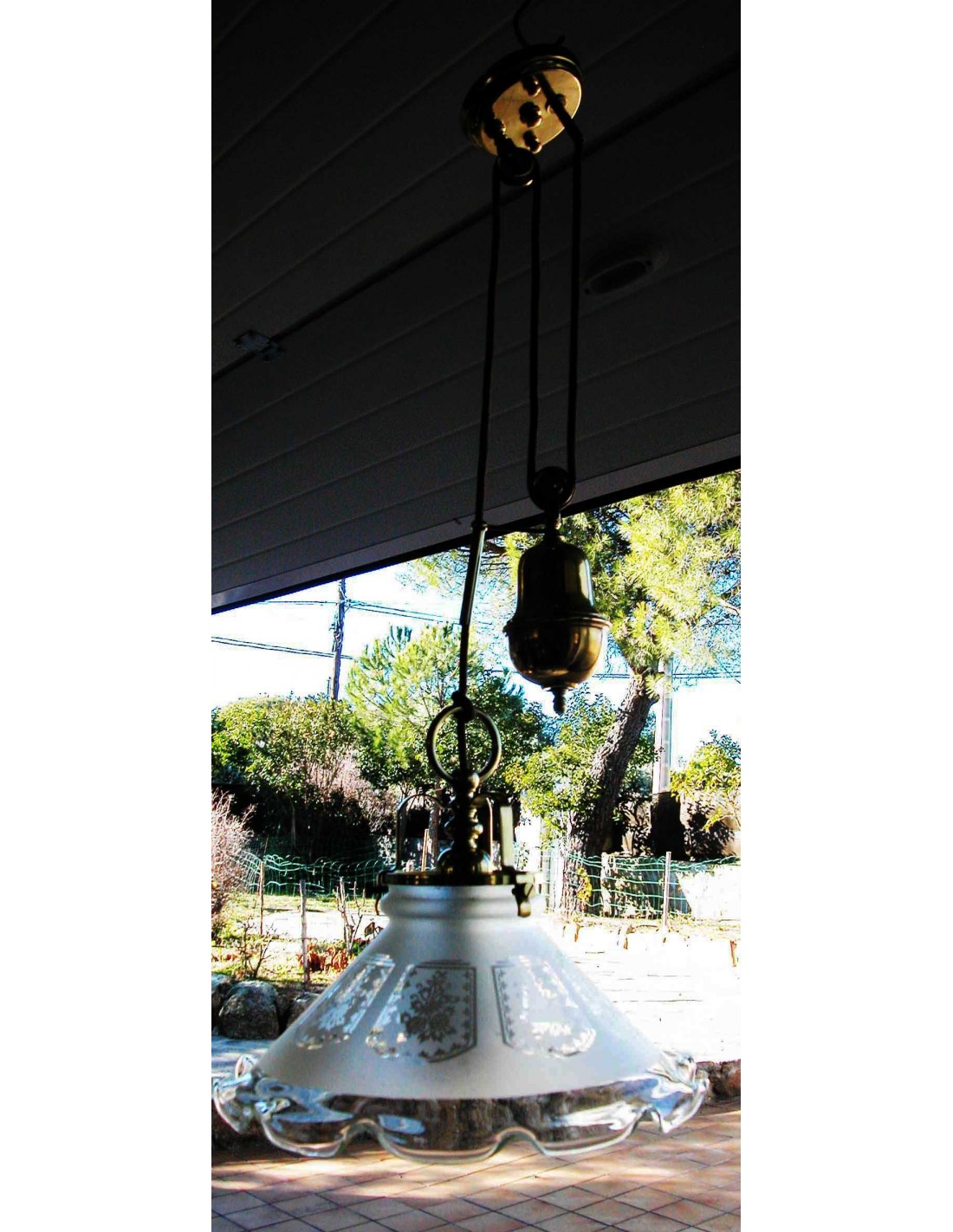 Preciosa lámpara colgante de techo, con polipasto combinación de dos poleas una polea fija para potencia y otra polea móvil ponderada ajustable subir y bajar la luz, con sistema de contrapeso de latón.