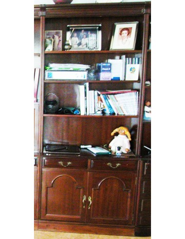 Librería de estilo inglés, en color caoba, del S.XX. MODULO CON BALDAS. En la parte superior, 3 baldas. Y en la parte inferior dos cajones y un armario con TRES CAJONES AMPLIOS.
