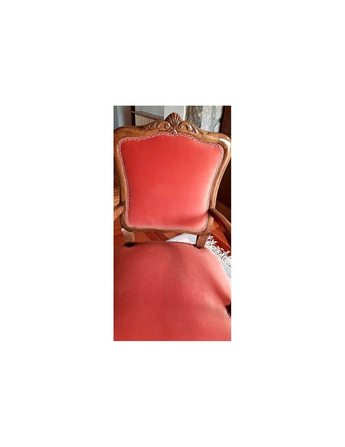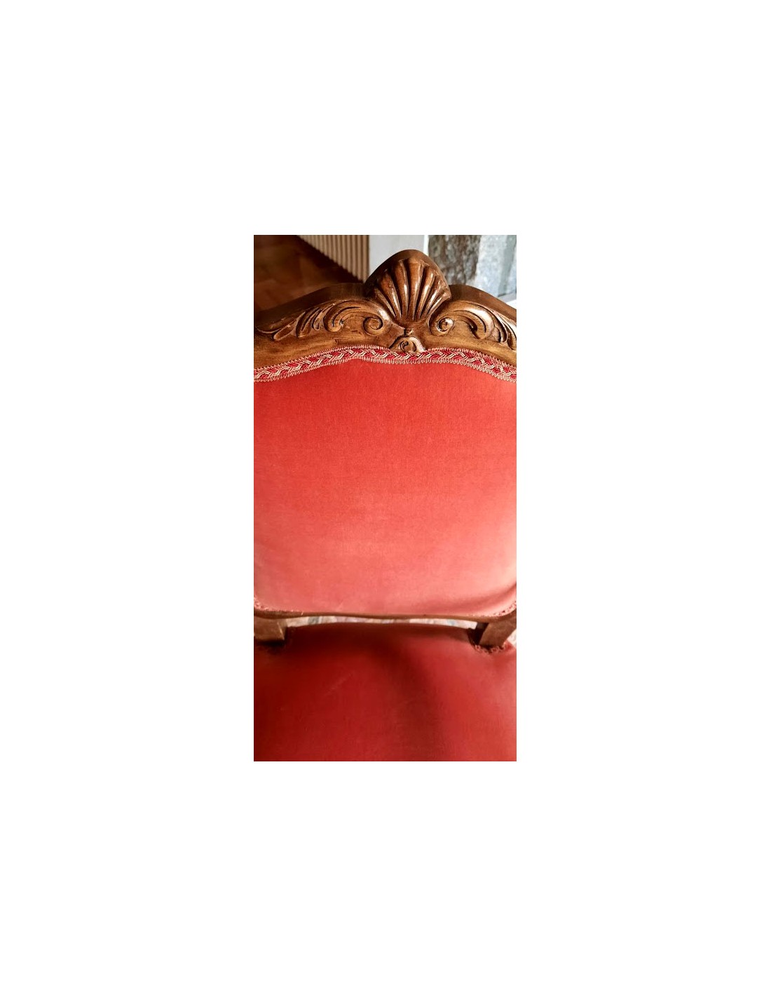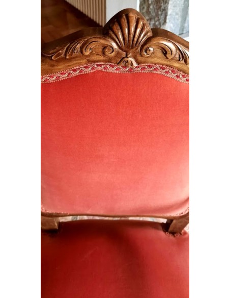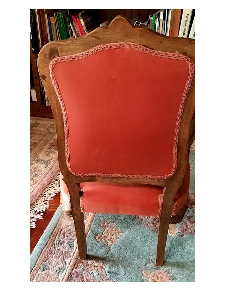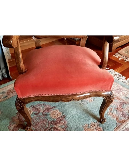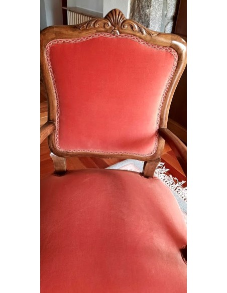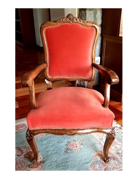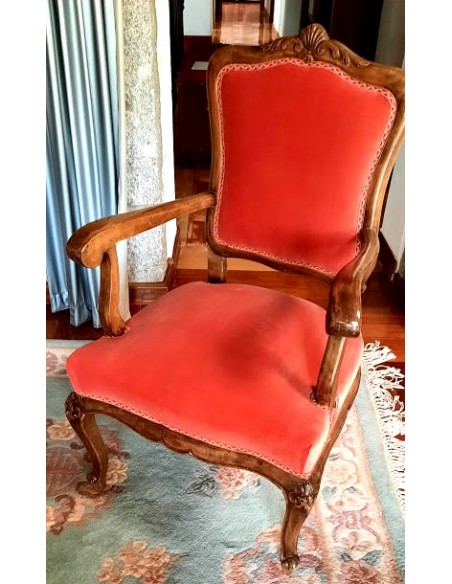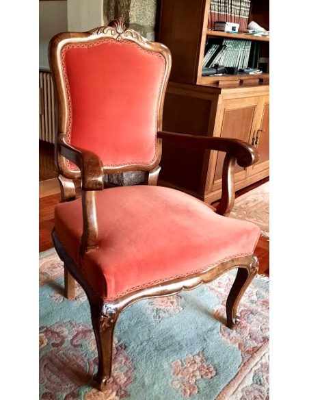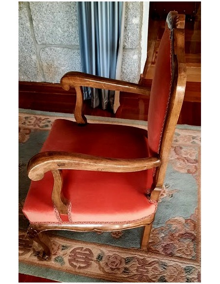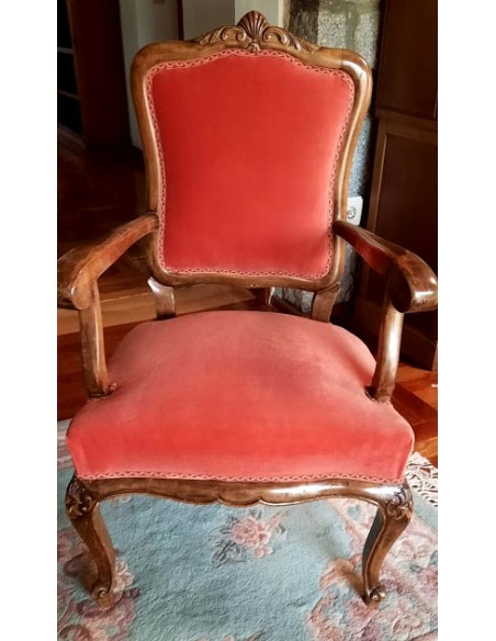 Su respaldo, recortado en forma de "balaustre", con con brazos de madera muy cortoneados para su apoyo.