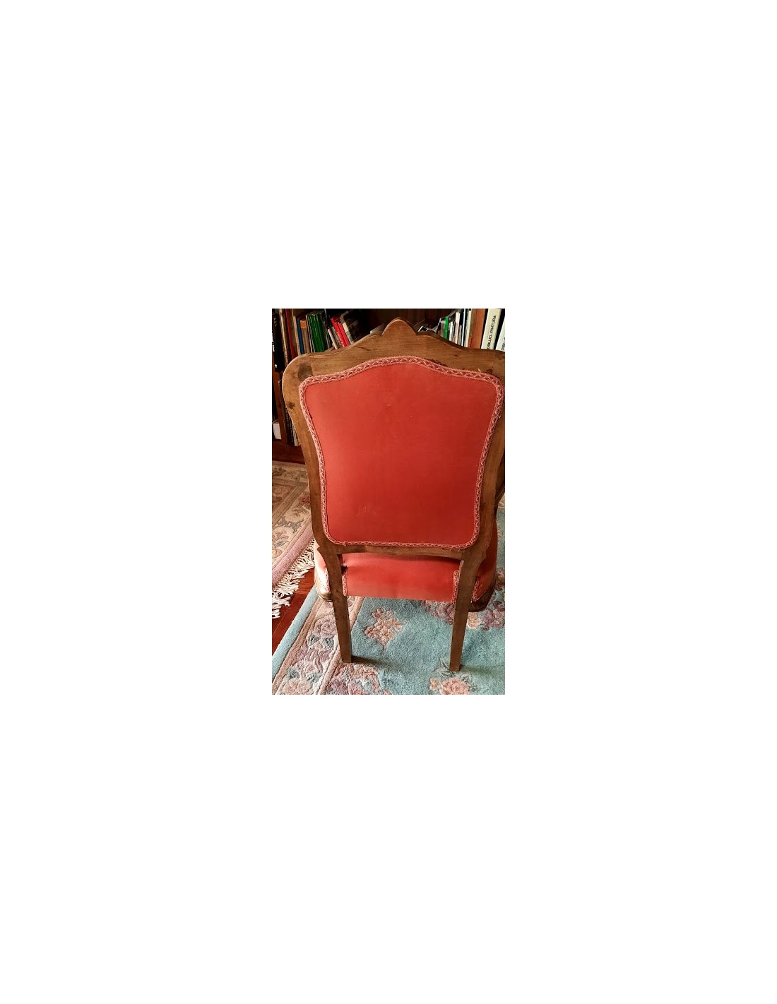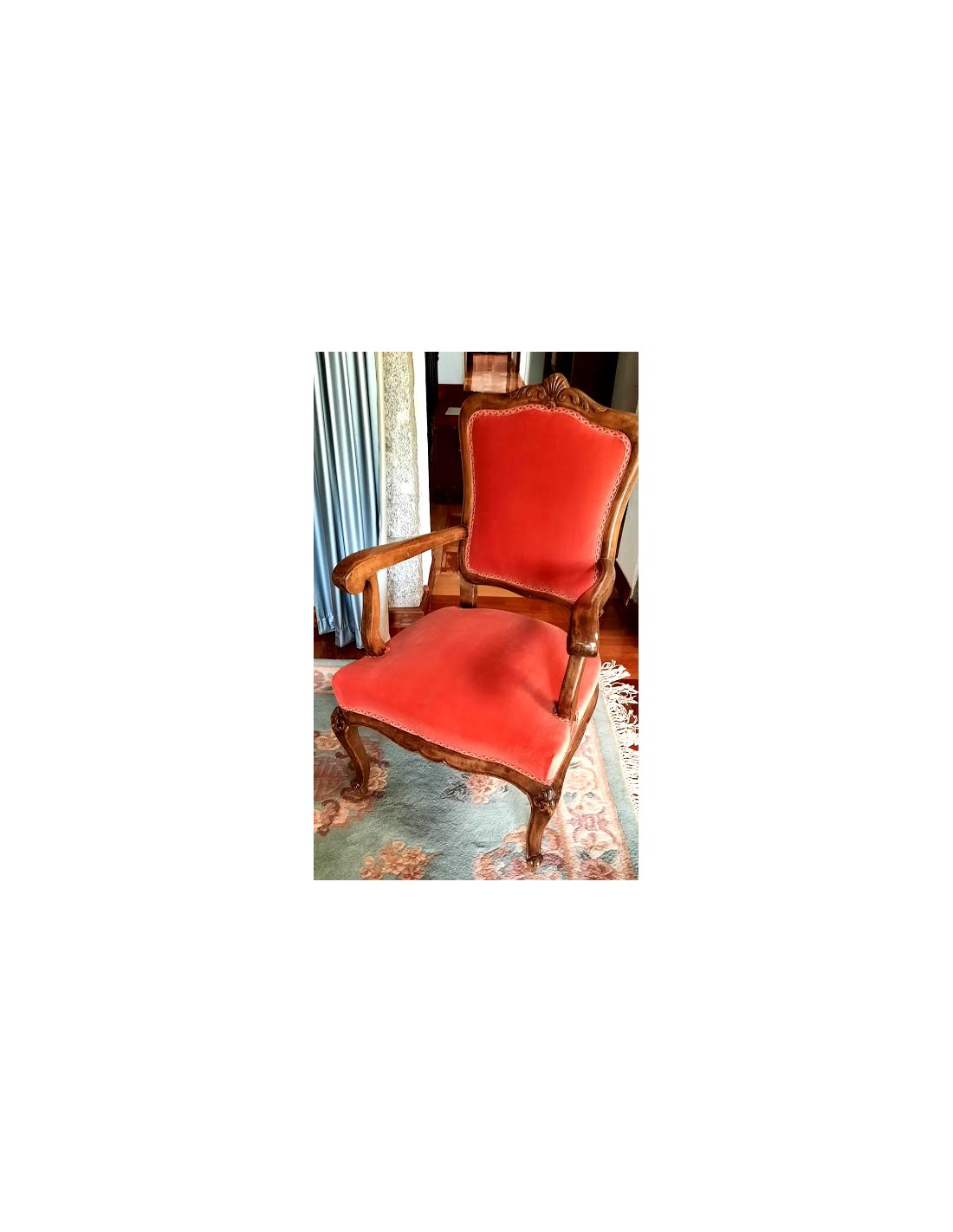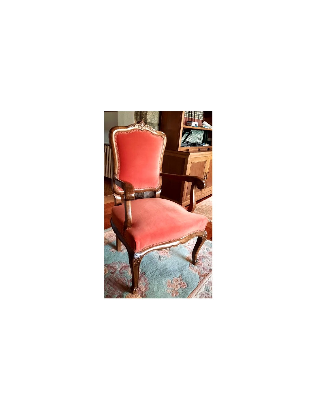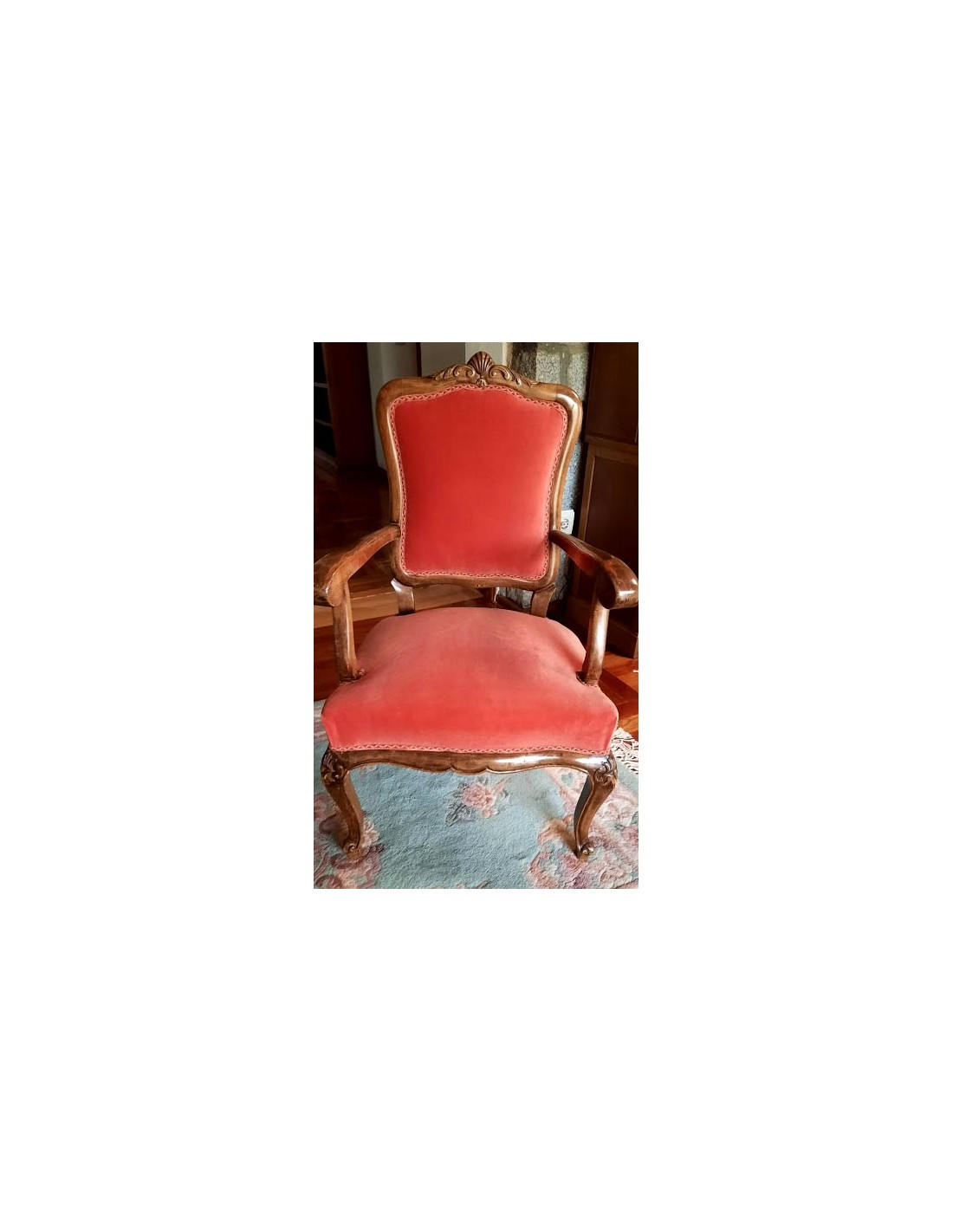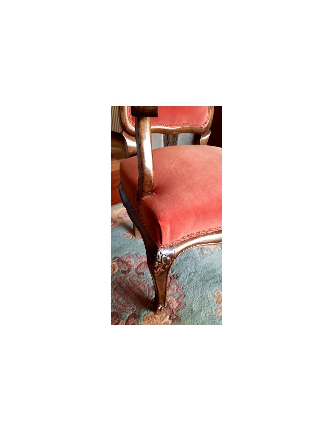 Su respaldo, recortado en forma de "balaustre", con con brazos de madera muy cortoneados para su apoyo.