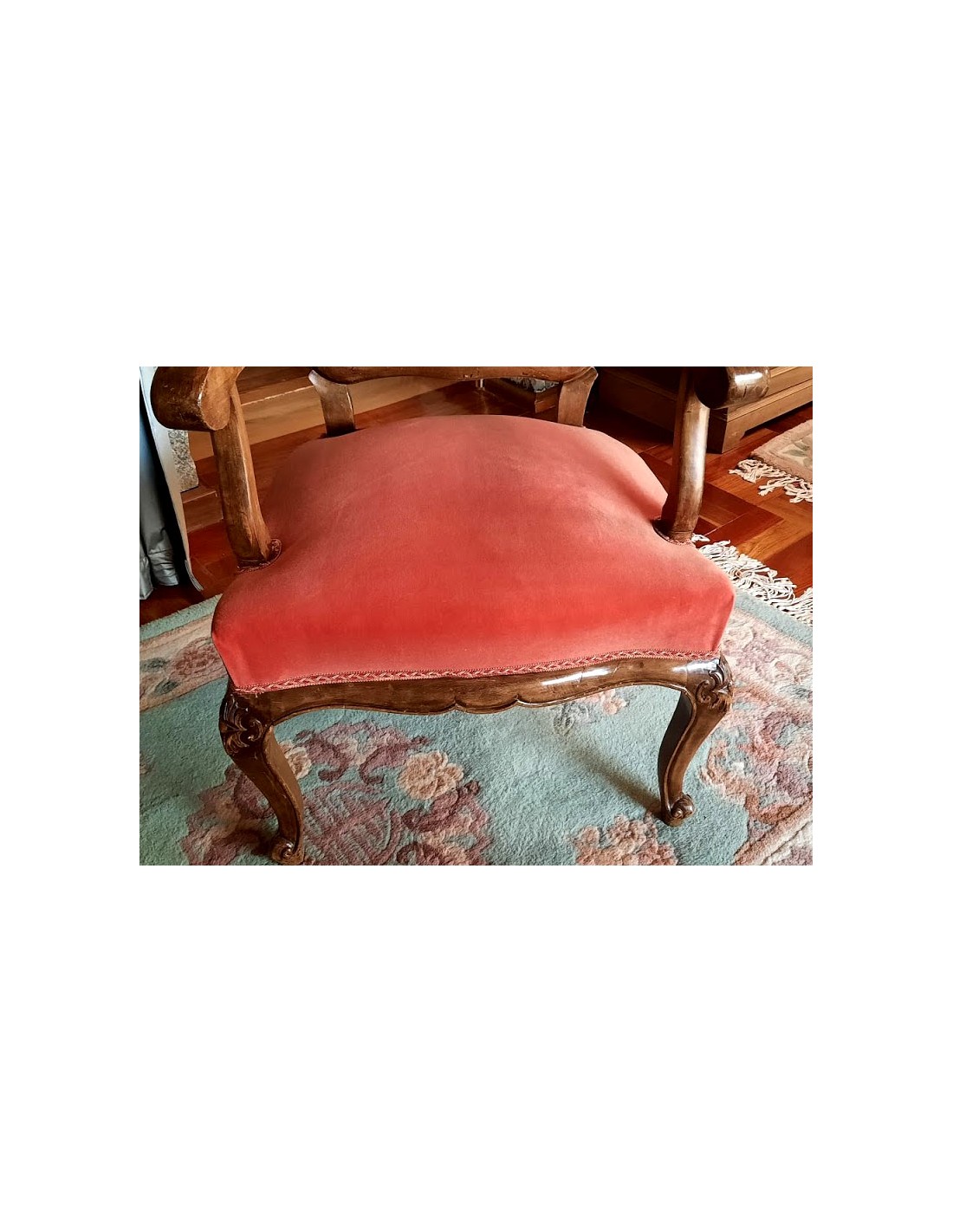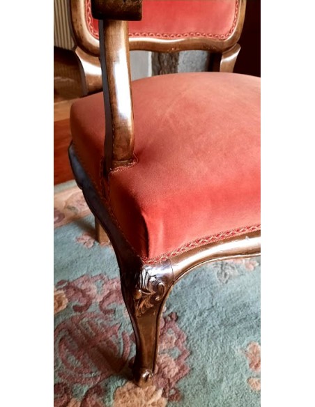 Patas estilo Reina Ana, la concha que se ve en las patas y en la terminación del respaldo es el motivo principal de su decoración.