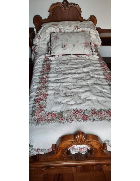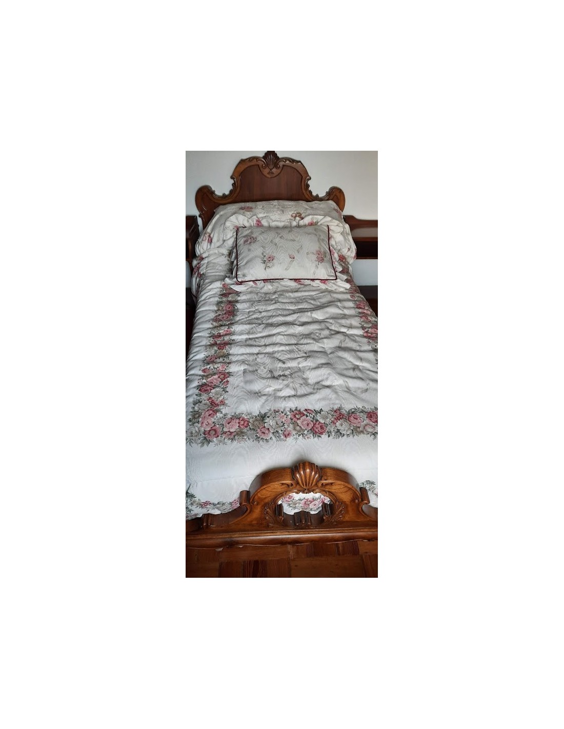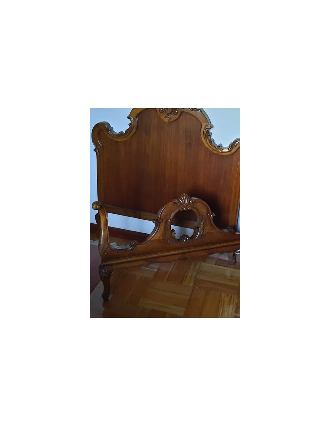 Pertenece a un dormitorio que tiene cabecero y piecero, mesilla con sus 2 bandejas y espejo, y un sillón y banqueta a juego.