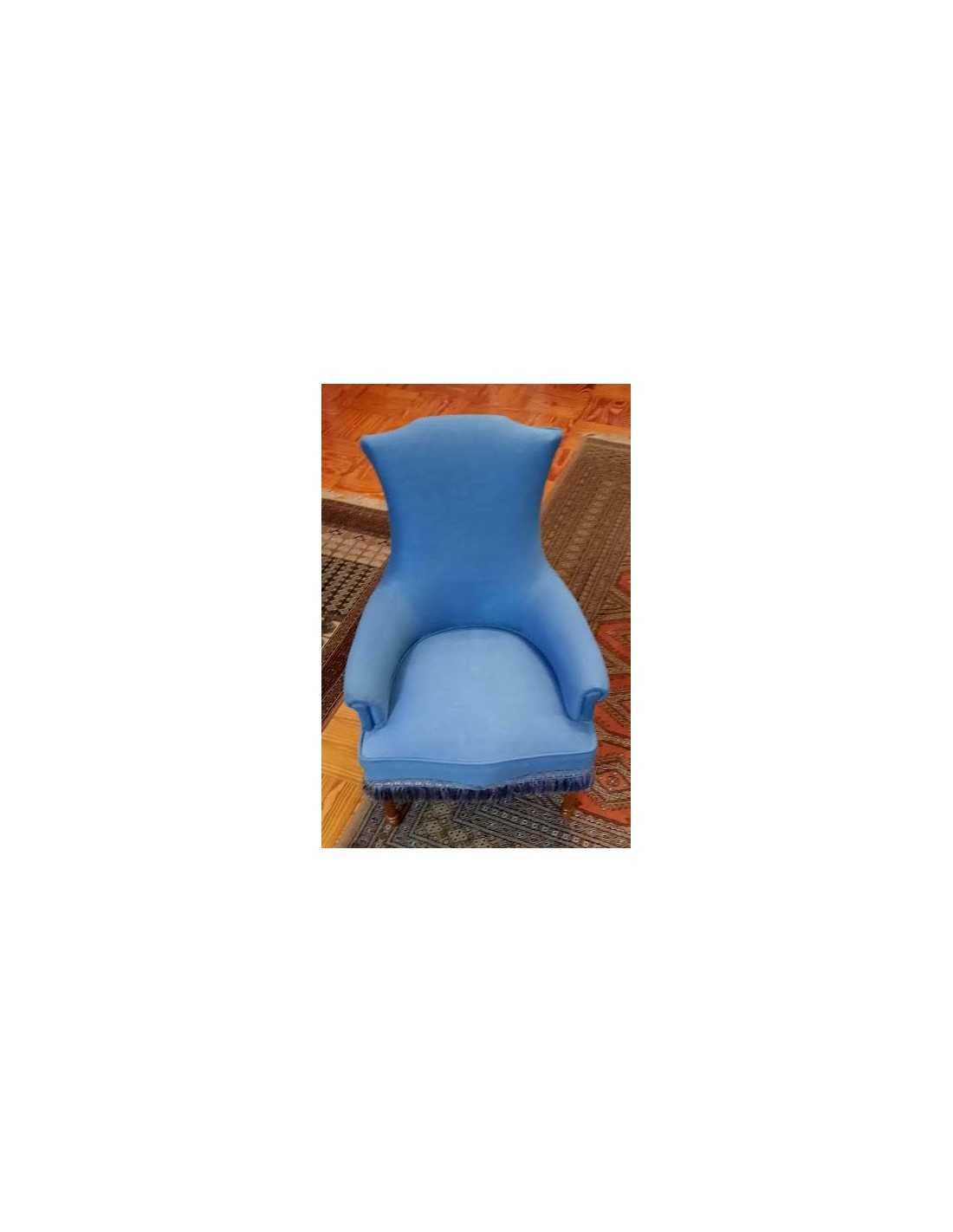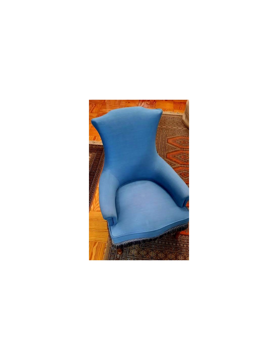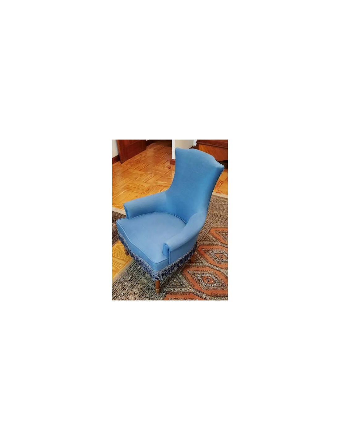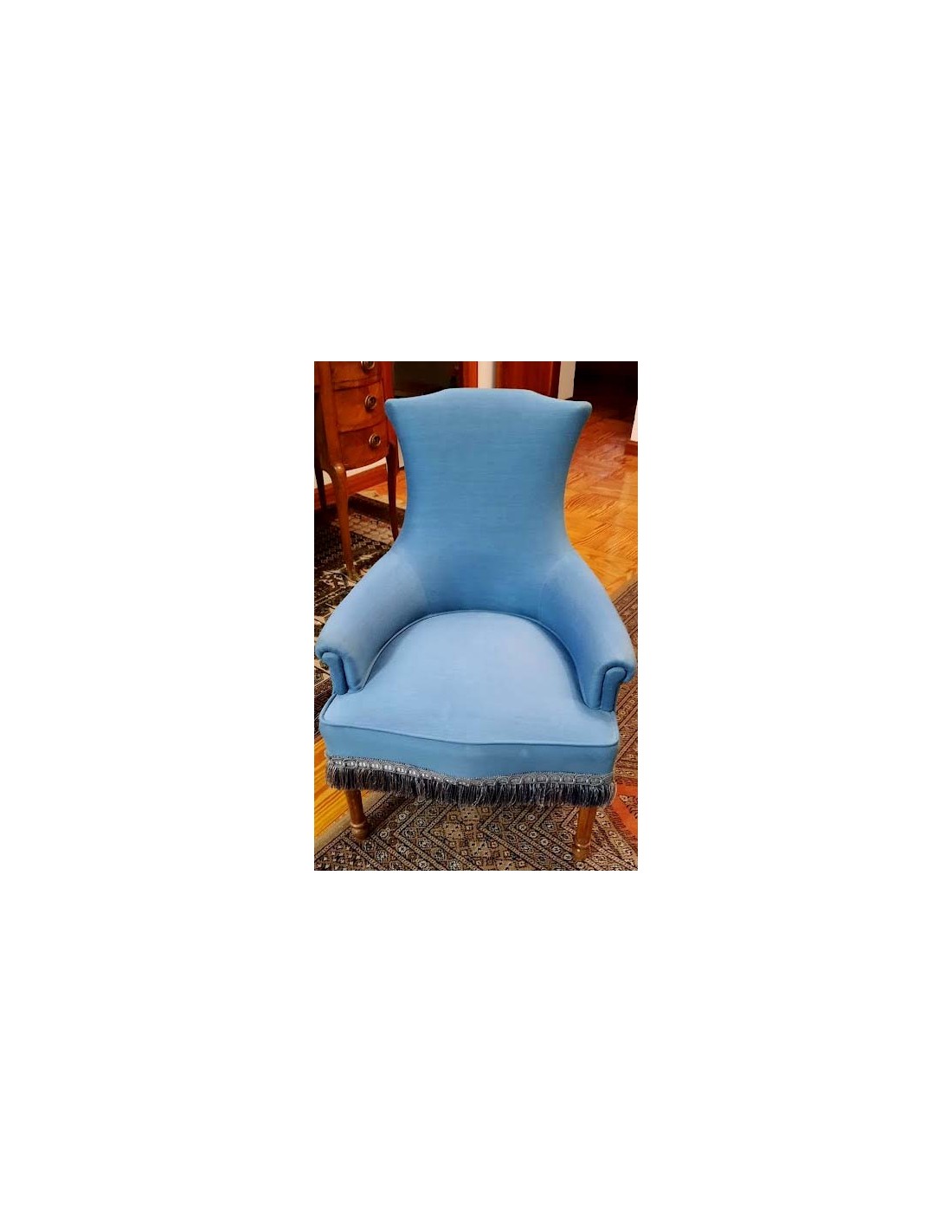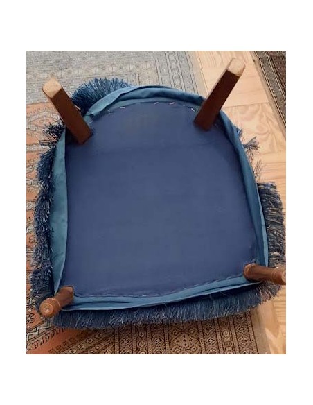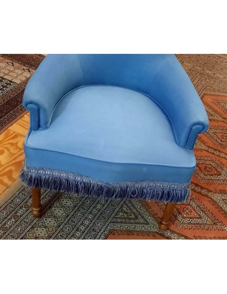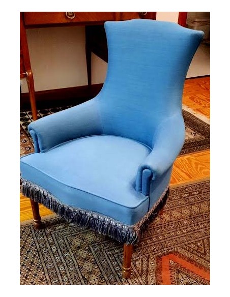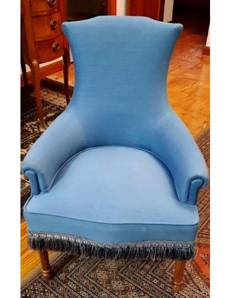 SILLÓN ART NOUVEAU CON INFUENCIAS DEL ESTILO LUIS XVI TAPIZADA EN AZUL REMATADA CON UN GALON TERMINADA EN FLECOS ALREDEDOR