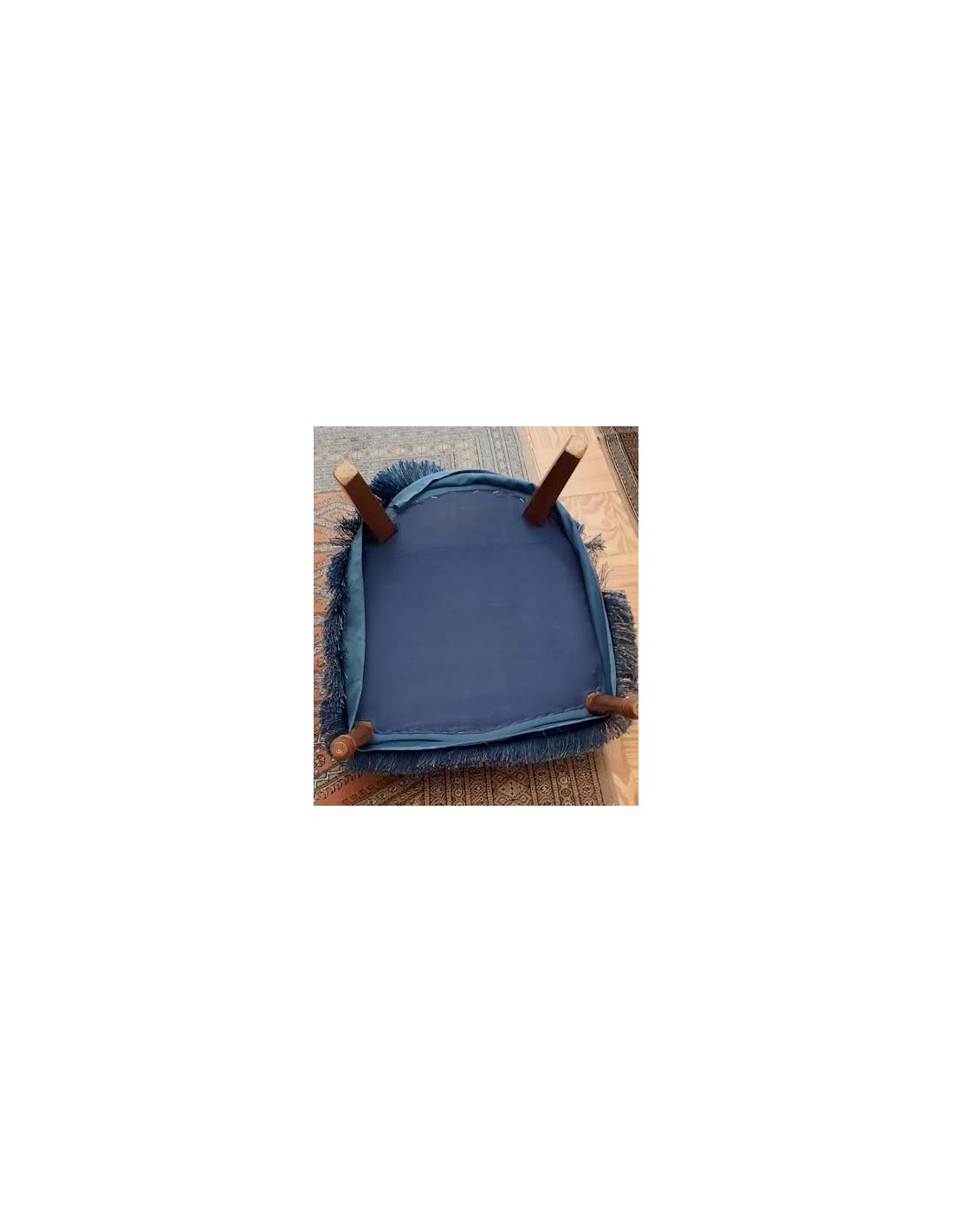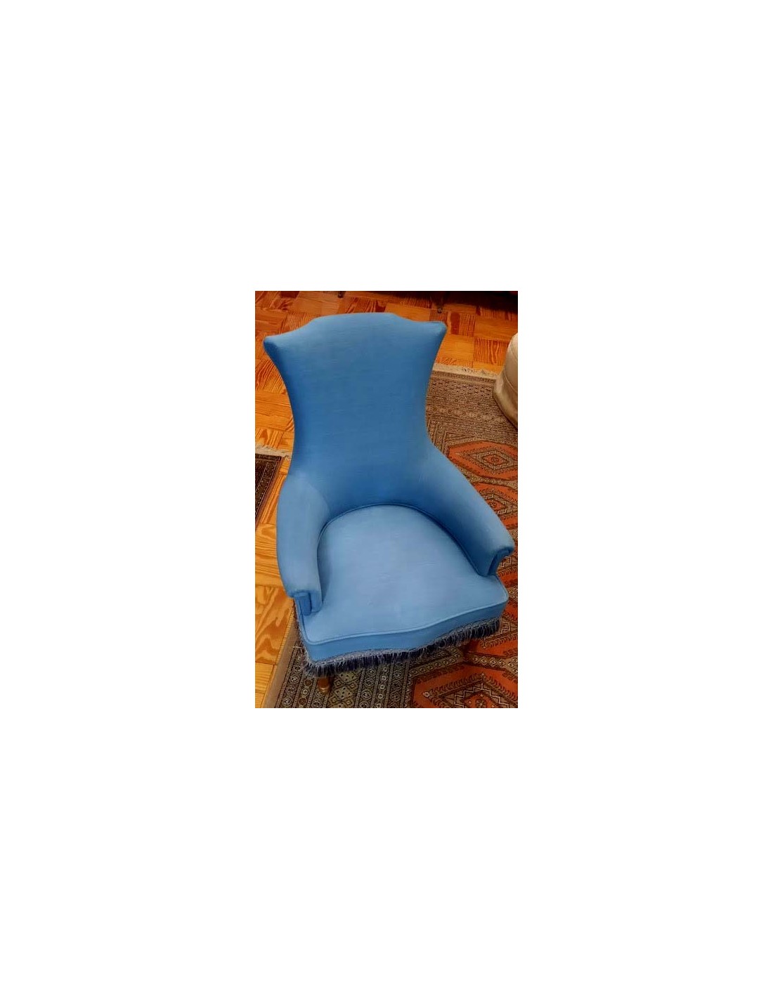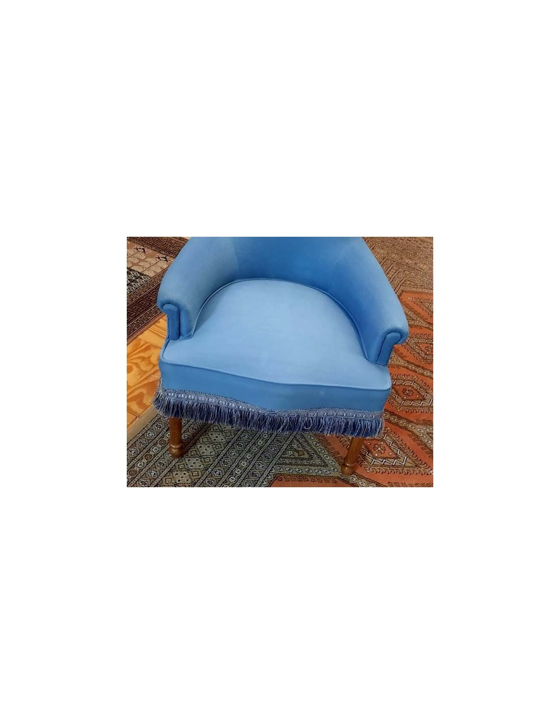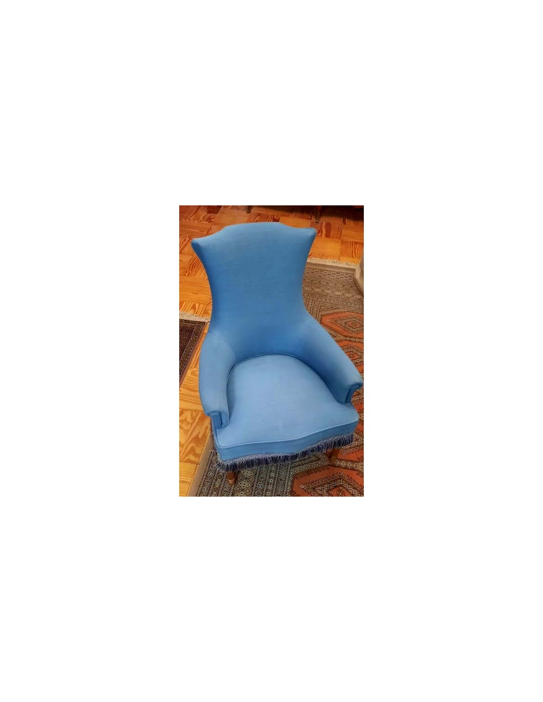 SILLÓN ART NOUVEAU CON INFUENCIAS DEL ESTILO LUIS XVI TAPIZADA EN AZUL REMATADA CON UN GALON TERMINADA EN FLECOS ALREDEDOR