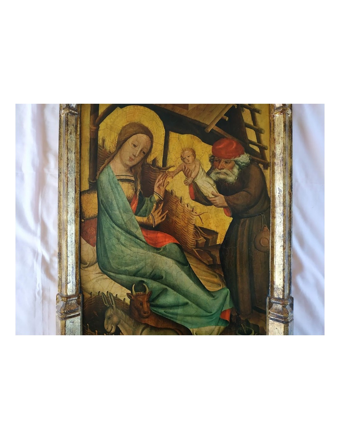 Reproducción de UNA TABLA FLAMENCA DEL PRIMITIVO GÓTICO que representa EL PORTAL DE BELÉN, con la Virgen sentada y San José dándole al Niño a los piés de la Virgen, en el lado izquierdo aparece el burro y el buey, y a la derecha un pote sobre un fuego.